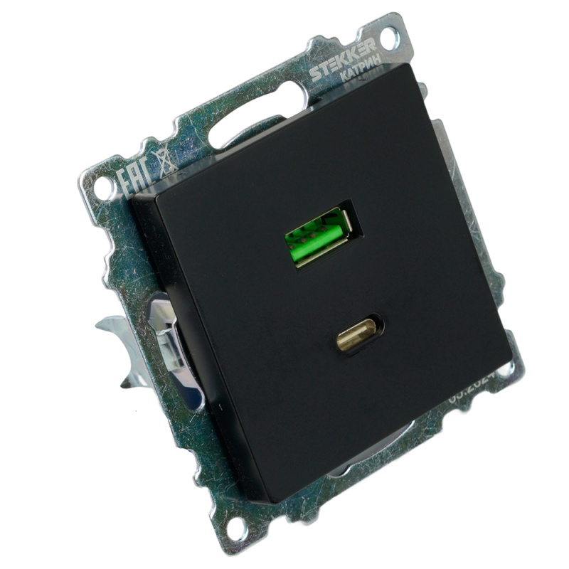 Розетка 2-местная USB + type C (механизм), STEKKER GLS10-7116-05, 250B, 3А, серия Катрин, черный 50055