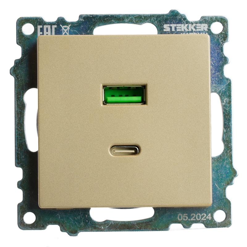 Розетка 2-местная USB + type C (механизм), 250В, 3А, max 20W, STEKKER, GLS10-7116-08, серия Катрин, золото 50053