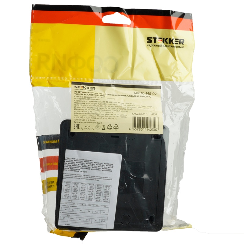 Характеристики Розетка 4-местная б/з открытой установки, квадрат, STEKKER, 250В, 10А, IP20, серия София, черный, MST10-14S-02