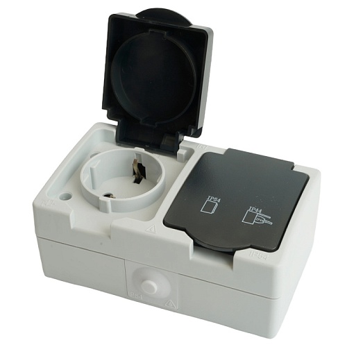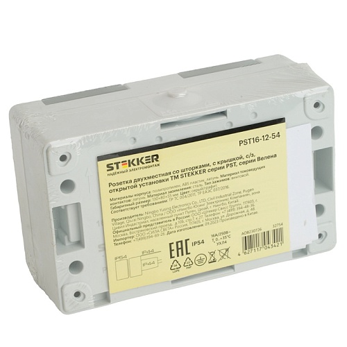 Характеристики Розетка 2-местная с крышкой с/з STEKKER PST16-12-54, пластик АВS, 250В, 16А, IP54, серый/графит