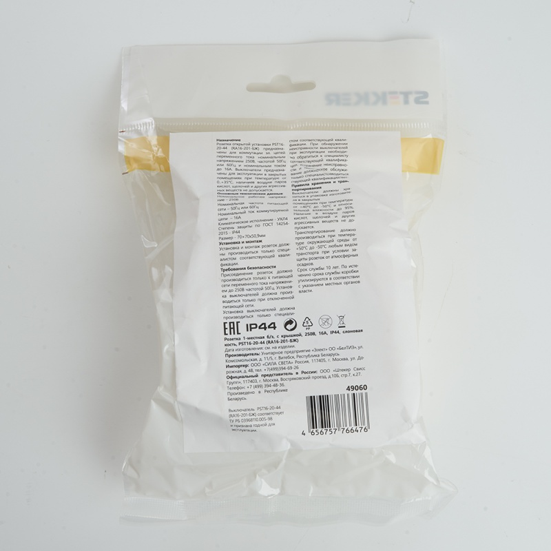 Характеристики Розетка 1-местная б/з с крышкой STEKKER, PST16-20-44 (RA 16-201-БЖ), пластик АВС, 250В, 16А, IP44, слоновая кость