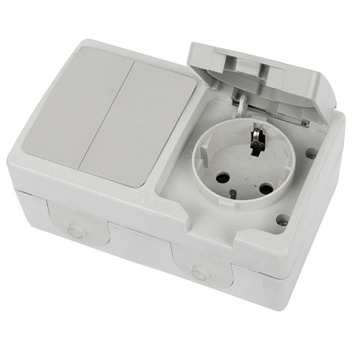 Блок: розетка 1-местная с/з + выключатель 2-клавишный STEKKER, PST16-21-54/10-221-54, белый/серый