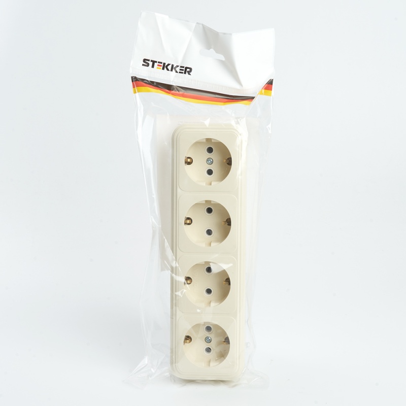 Розетка 4-местная с/з STEKKER, PST16-61-20 (RA 16-466-БЖ), пластик АВС, 250В, 16А, IP20, слоновая кость