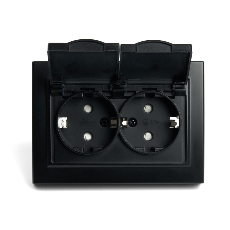 Розетка 2-местная с/з с крышкой, STEKKER, PST16-9015-03, 250В, 16А, серия Эрна, черный