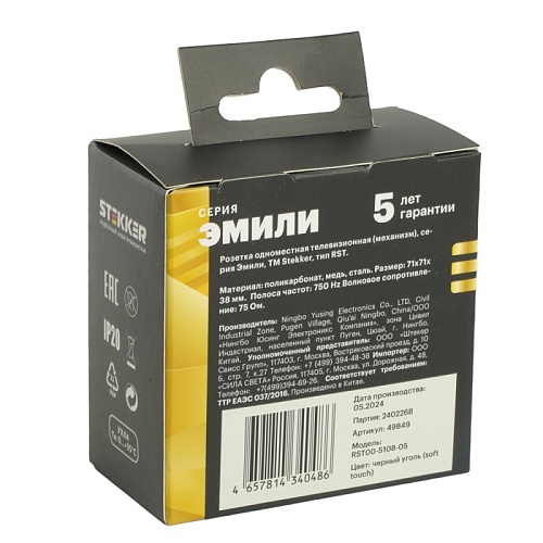 Отзывы о Розетка телевизионная 1-местная (механизм), STEKKER, 75 Ом, 5-862МГц, серия Эмили, RST00-5108-05, черный уголь, soft touch
