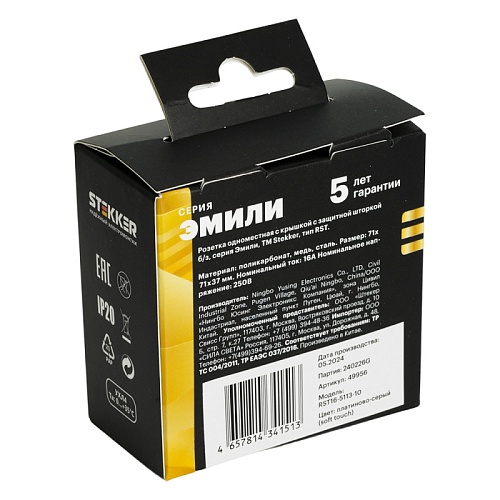 Характеристики Розетка 1-местная с крышкой с защ. штор, STEKKER, б/з, 250В, 16А, серия Эмили, RST16-5113-10, платиново-серый, soft touch