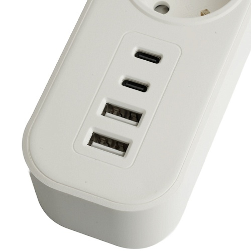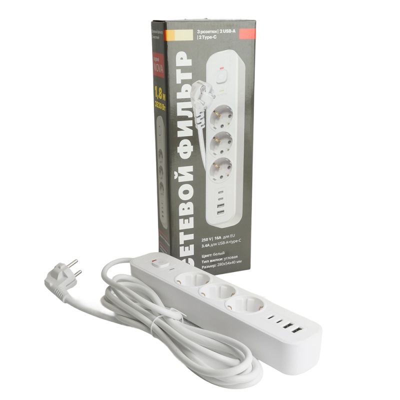 Сетевой фильтр 3-местный с/з STEKKER 3x1мм2, 1,8 м, 250В, 16А, 2 USB-A+2 Type-C, серия Nova, белый
