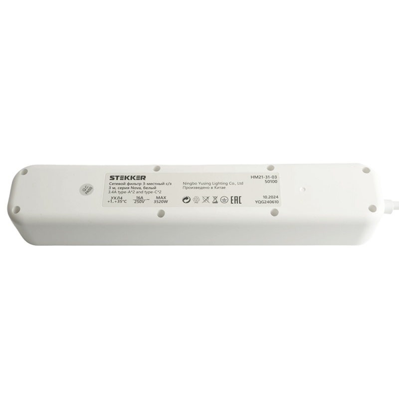 Характеристики Сетевой фильтр 3-местный с/з STEKKER 3x1мм2, 1,8 м, 250В, 16А, 2 USB-A+2 Type-C, серия Nova, белый