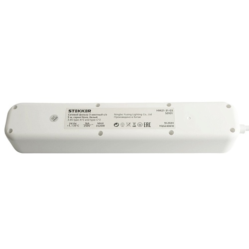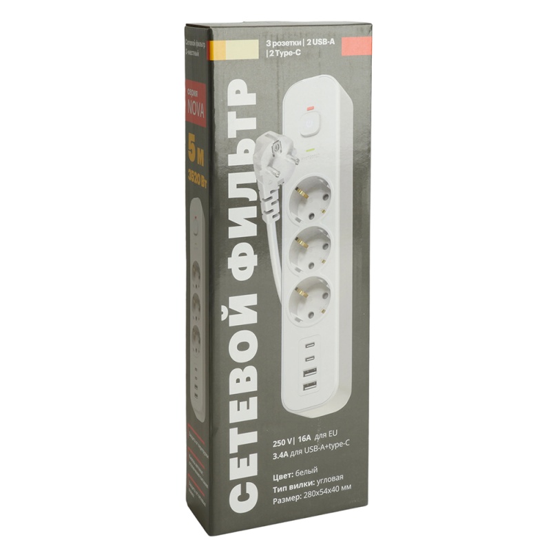 Характеристики Сетевой фильтр 3-местный с/з STEKKER 3x1мм2, 5 м, 250В, 16А, 2 USB-A+2 Type-C 3, серия Nova, белый