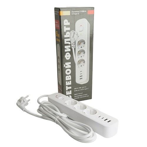 Отзывы о Сетевой фильтр 3-местный с/з STEKKER 3x1мм2, 5 м, 250В, 16А, 2 USB-A+2 Type-C 3, серия Nova, белый