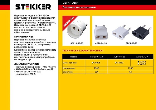 Характеристики Разветвитель сетевой 3-местный компактный б/з STEKKER ADP10-16-20, 250В, 10A, IP20, белый