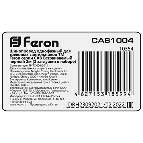 Шинопровод встраиваемый для трековых однофазных светильников, черный, 2м, в наборе токоввод, заглушка, крепление, CAB1004 10354