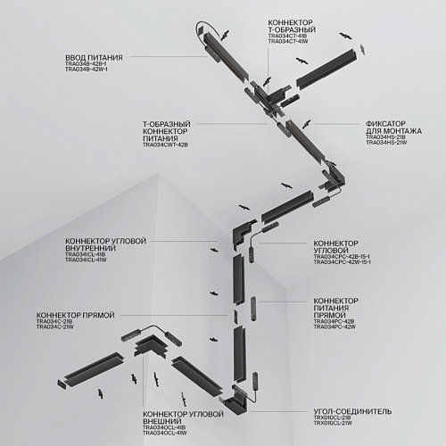 Комплектующие для низковольтной магнитной трековой системы Exility в черном и белом цветах. Разнообразие аксессуаров позволяет собрать свою уникальную конструкцию для накладного монтажа, подвесного, встраиваемого под гипсокартон и встраиваемого в натяжные потолки.