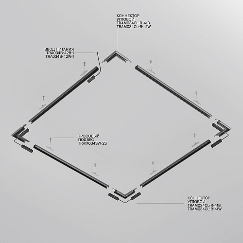 Комплектующие для низковольтной магнитной трековой системы Exility в черном и белом цветах. Разнообразие аксессуаров позволяет собрать свою уникальную конструкцию для накладного монтажа, подвесного, встраиваемого под гипсокартон и встраиваемого в натяжные потолки.
