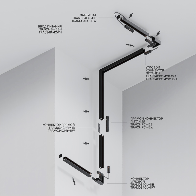 Комплектующие для низковольтной магнитной трековой системы Exility в черном и белом цветах. Разнообразие аксессуаров позволяет собрать свою уникальную конструкцию для накладного монтажа, подвесного, встраиваемого под гипсокартон и встраиваемого в натяжные потолки.