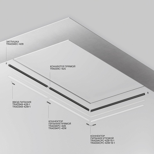 Комплектующие для низковольтной магнитной трековой системы Exility в черном и белом цветах. Разнообразие аксессуаров позволяет собрать свою уникальную конструкцию для накладного монтажа, подвесного, встраиваемого под гипсокартон и встраиваемого в натяжные потолки.