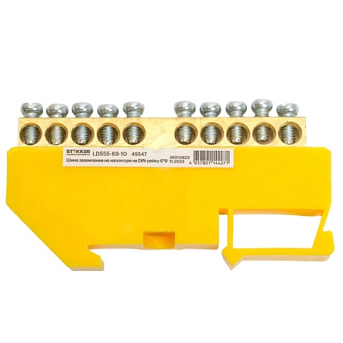 Шина"PE" на изоляторе STEKKER 6*9 на DIN-рейку 10 выводов, желтый, LD555-69-10