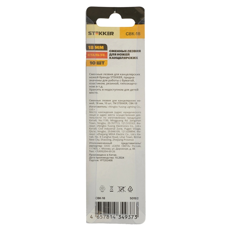 Характеристики Сменные лезвия для канцелярских ножей, блистер, 18 мм, 10 шт, STEKKER CBK-18