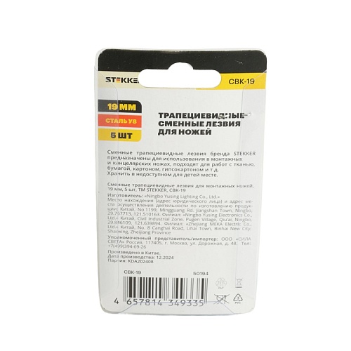 Характеристики Сменные трапециевидные лезвия для монтажных ножей, 19 мм, 5 шт, STEKKER CBK-19