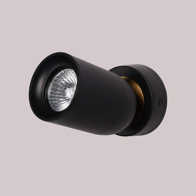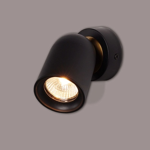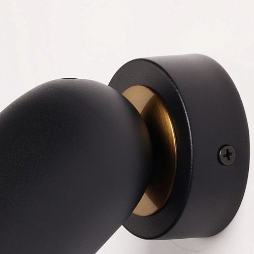 Металлическое основание настенного бра окрашено в черный цвет. Основание декорировано металлическим элементом круглой формы, гальванизированным в цвет латуни. Корпус плафона выполнен из сплава алюминия и окрашен в цвет основания.