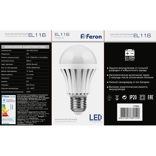 Характеристики Светильник аккумуляторный, 5W Е27 AC/DC (литий-ионная батарея), белый, EL116