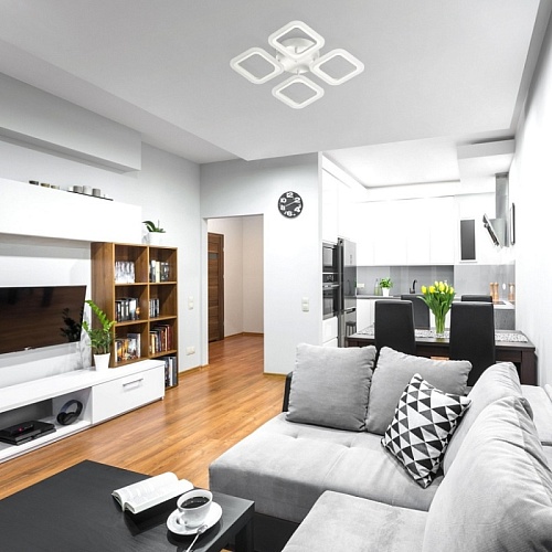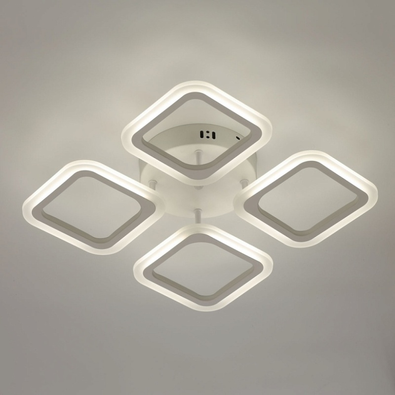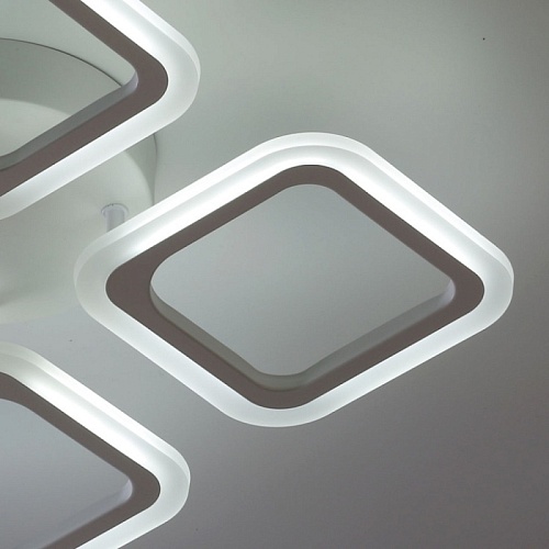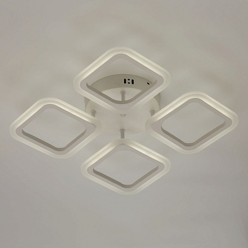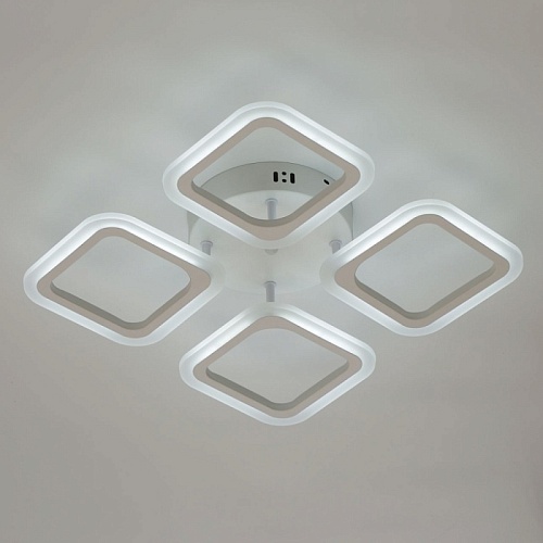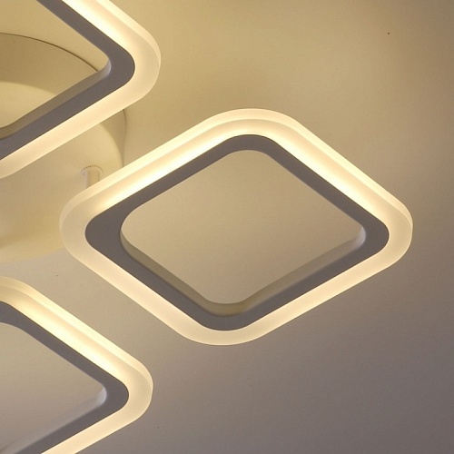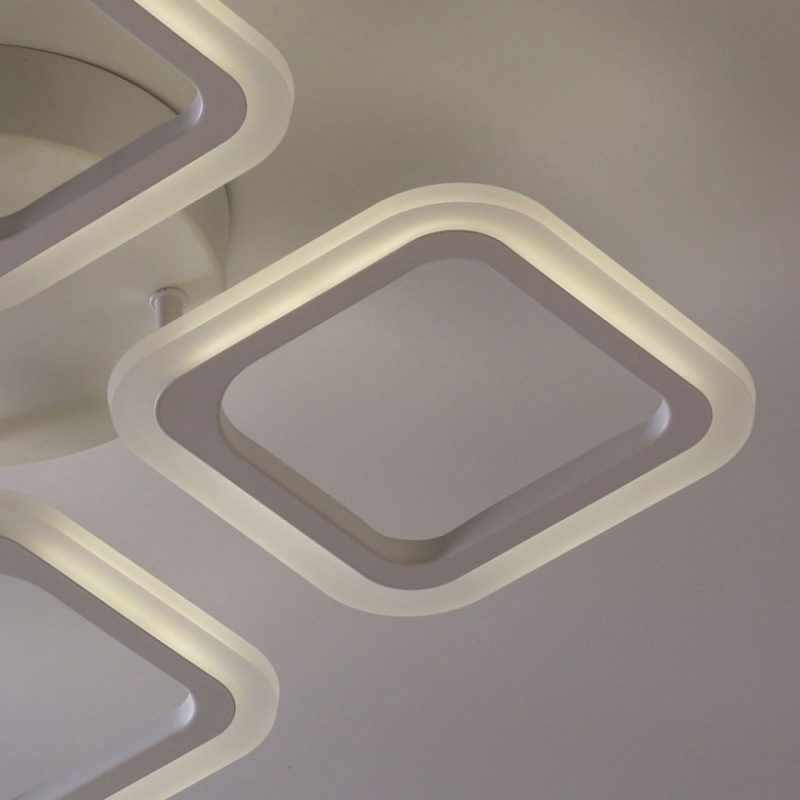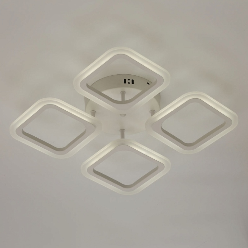 Металлическое основание и плафоны потолочной люстры окрашены в белый цвет. Светодиодные источники света закрыты белым матовым акрилом. Светильник приходит в состоянии частичной сборки в компактной упаковке: вся электрика подсоединена, достаточно закрепить плафоны на корпусе.