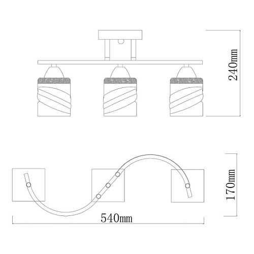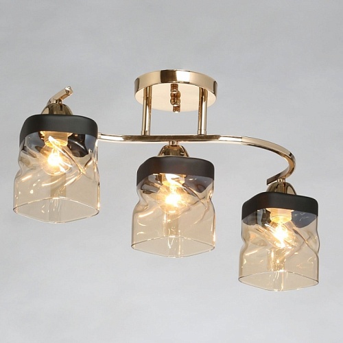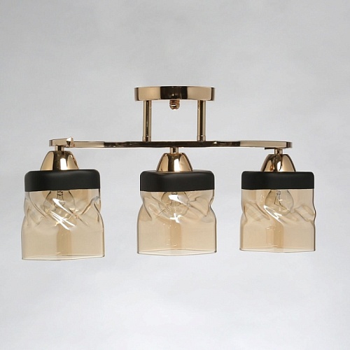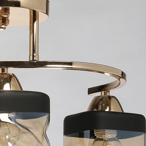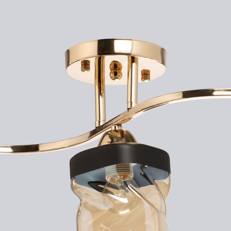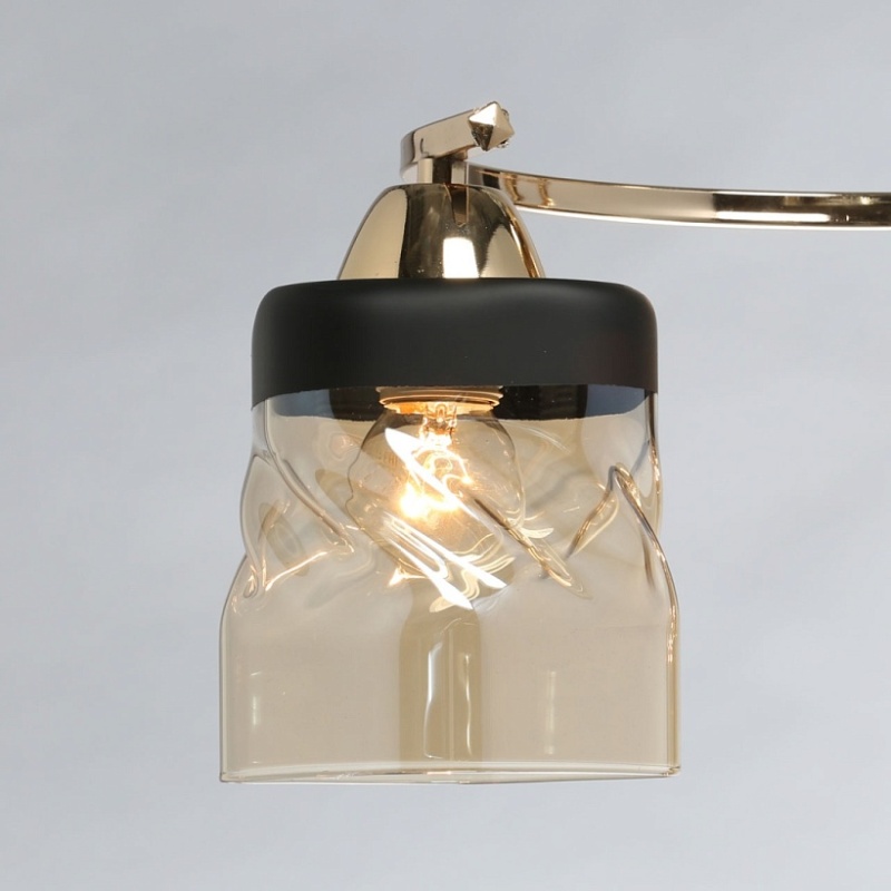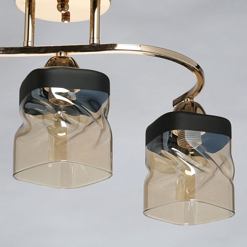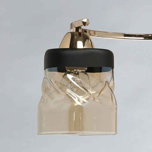 Металлическое основание светильника гальванизировано в цвет золота. Стеклянные плафоны отлиты в сложную перекрученную форму и гальванизированы в коньячный цвет. У основания плафоны окрашены в черный цвет.