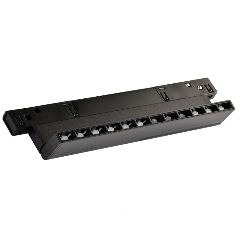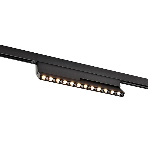 Трековый линейный поворотный светильник в черном цвете с гнездовой структурой светодиодов, угол рассеивания света 30°.