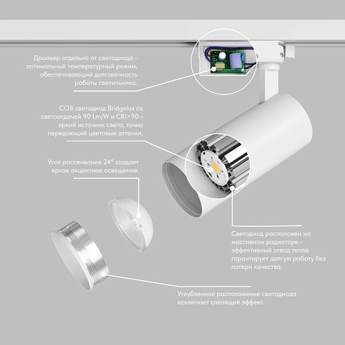 KOPER - серия однофазных поворотных трековых светильников для акцентного освещения. COB светодиод Bridgelux со светоотдачей 90 Lm/W и CRI>90 - яркий источник света, точно передающий цветовые оттенки. Углубленное расположение светодиода исключает слепящий эффект. Корпус светильника поворачивается вокруг своей оси на 355°. Угол излучения составляет 24°. Драйвер расположен отдельно от светодиода для оптимального температурного режима. Это обеспечивает долговечность работы светильника. Светодиод расположен на массивном радиаторе для эффективного отвода тепла. Это гарантирует долгую работу без потери качества. Идеальное решение для HORECA. Срок гарантии 3 года.