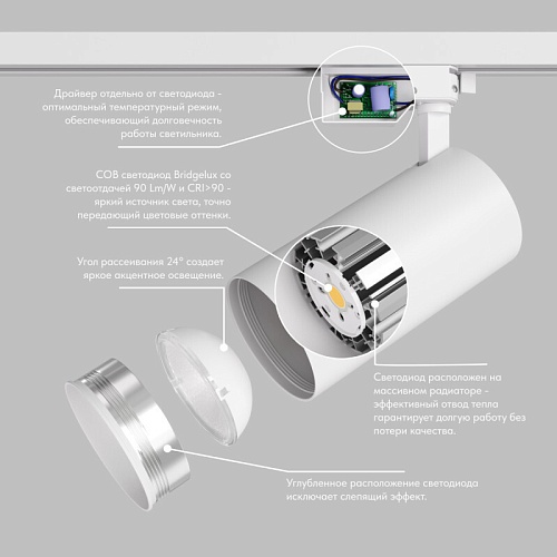 KOPER - серия однофазных поворотных трековых светильников для акцентного освещения. COB светодиод Bridgelux со светоотдачей 90 Lm/W и CRI>90 - яркий источник света, точно передающий цветовые оттенки. Углубленное расположение светодиода исключает слепящий эффект. Корпус светильника поворачивается вокруг своей оси на 355°. Угол излучения составляет 24°. Драйвер расположен отдельно от светодиода для оптимального температурного режима. Это обеспечивает долговечность работы светильника. Светодиод расположен на массивном радиаторе для эффективного отвода тепла. Это гарантирует долгую работу без потери качества. Идеальное решение для HORECA. Срок гарантии 3 года.
