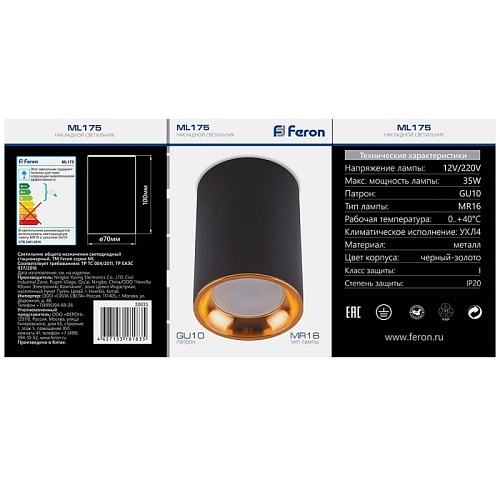 Характеристики Светильник потолочный Feron ML175 MR16 GU10 35W 230V, черный, золото