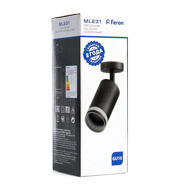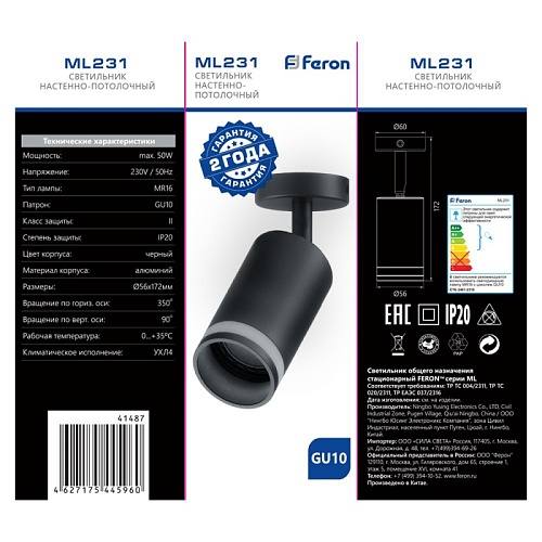 Характеристики Светильник Feron ML231 LUNA настенно-потолочный под лампу GU10, черный