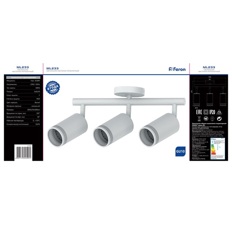 Характеристики Светильник Feron ML233 LUNA настенно-потолочный под лампу GU10, белый