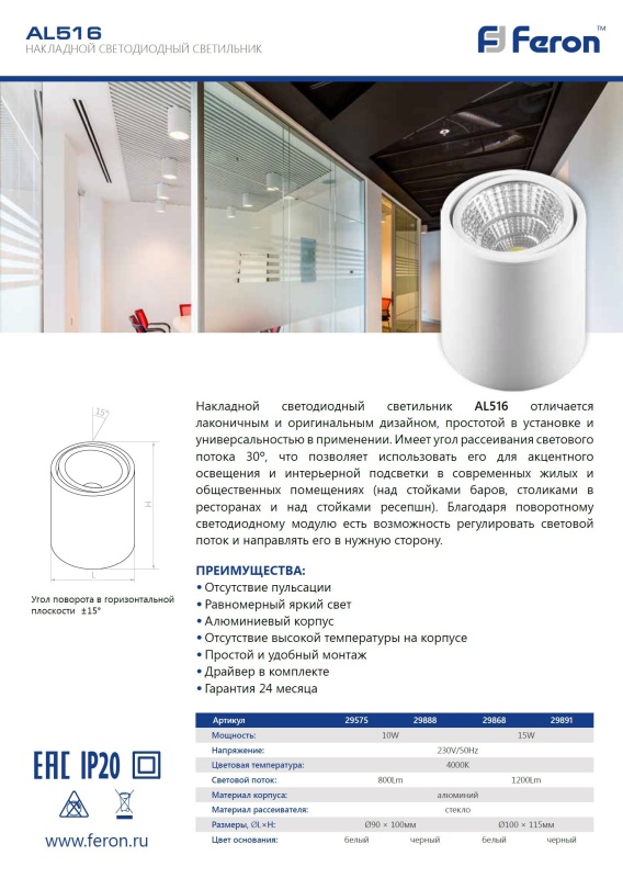 Характеристики Светодиодный светильник Feron AL516 накладной 10W 4000K белый поворотный