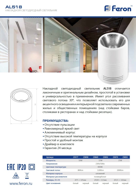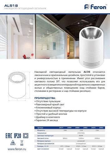 Характеристики Светодиодный светильник Feron AL518 накладной 10W 4000K белый