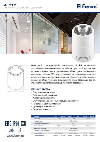 Характеристики Светильник накладной светодиодный для акцентного освещения FERON AL518 29869