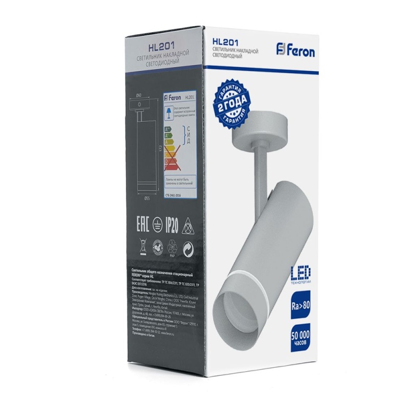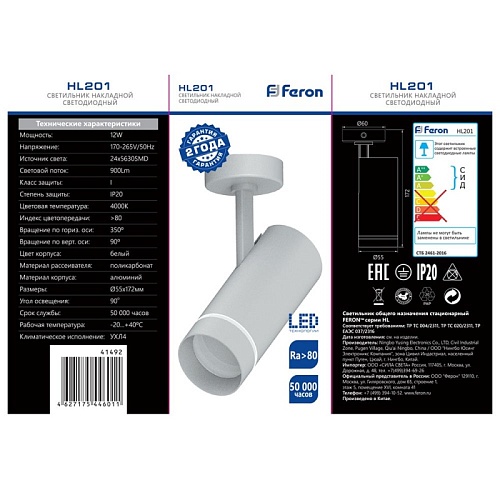 Характеристики Светодиодный светильник Feron HL201 накладной 12W 4000K белый поворотный