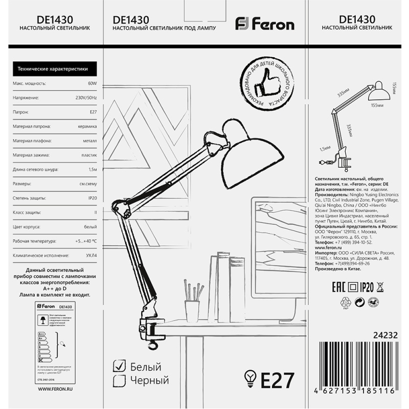 Характеристики Светильник под лампу Feron DE1430 60W, 230V, патрон E27 на струбцине, белый