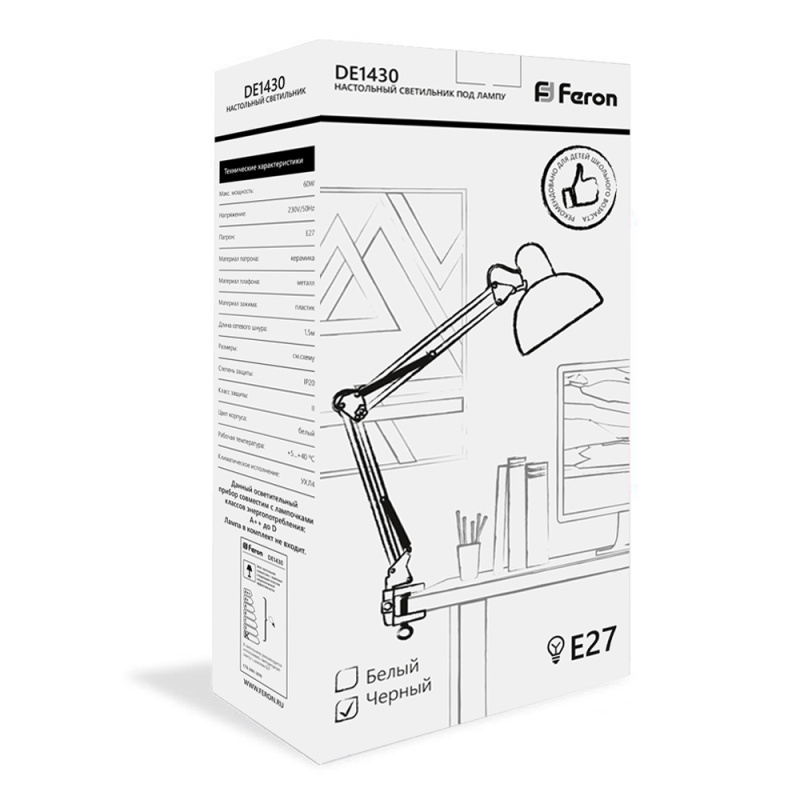 Характеристики Светильник под лампу Feron DE1430 60W, 230V, патрон E27 на струбцине, черный