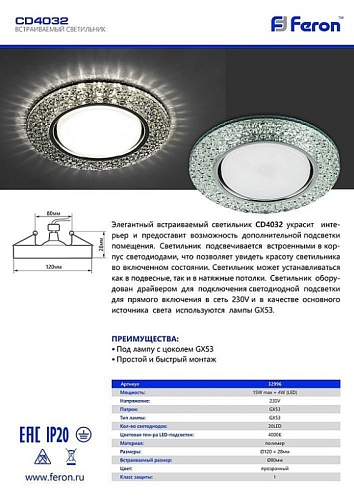 Характеристики Светильник потолочный встраиваемый FERON CD4032 32996