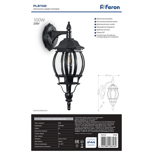 Характеристики Светильник садово-парковый Feron 8102/PL8102 восьмигранный на стену вниз 100W E27 230V, черный