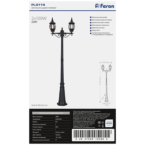 Характеристики Светильник садово-парковый Feron 8114/PL8114 столб 2*100W E27 230V, черный