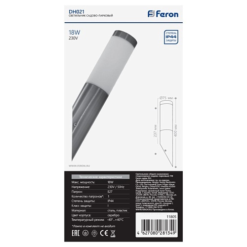 Светильник садово-парковый Feron DH022-650, Техно столб, max.18W E27 230V, серебро
