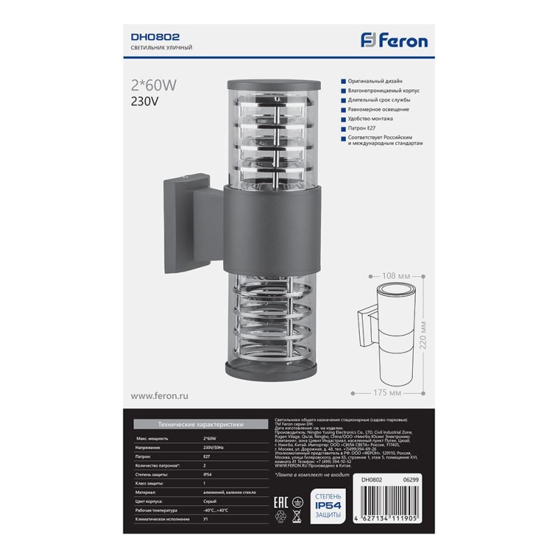 Характеристики Светильник садово-парковый Feron DH0802, на стену вверх/вниз, 2*E27 230V, серый