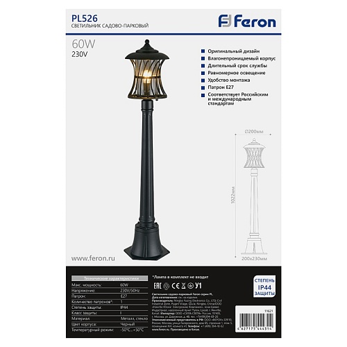 Характеристики Светильник садово-парковый Feron PL526 столб 60W E27 230V, черный