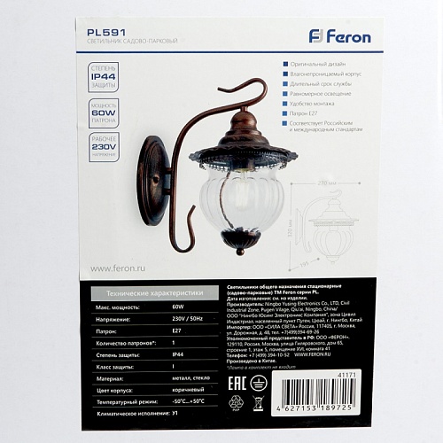 Характеристики Светильник садово-парковый Feron PL591 на стену вниз 60W 230V E27, коричневый