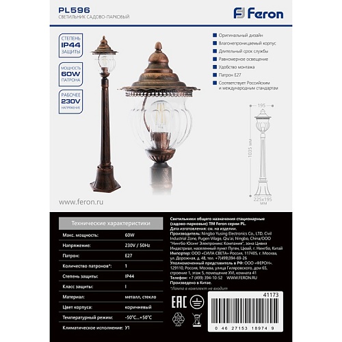Характеристики Светильник садово-парковый Feron PL596 столб 60W 230V E27, коричневый