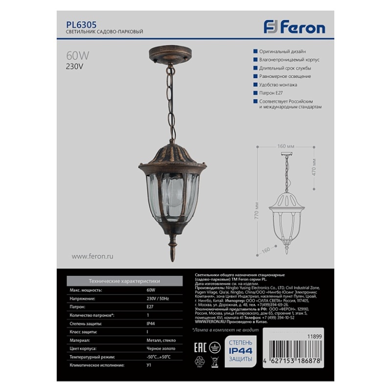 Светильник садово-парковый Feron PL6305 шестигранный на цепочке 60W E27 230V, черное золото