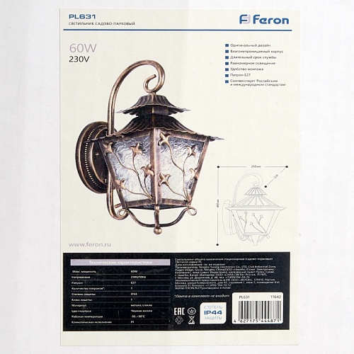 Характеристики Светильник садово-парковый Feron PL631 на стену вниз 60W 230V E27, черное золото