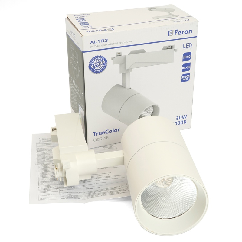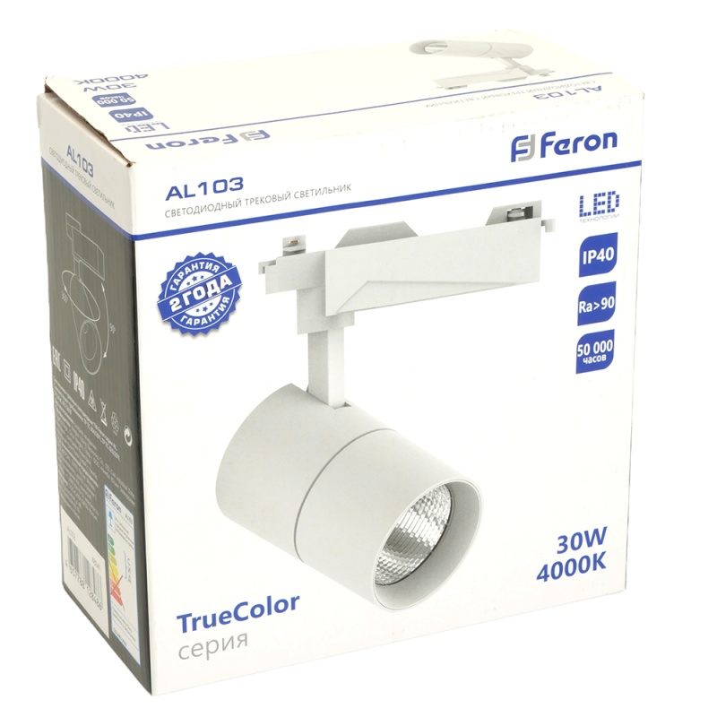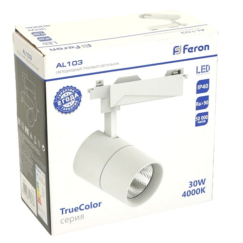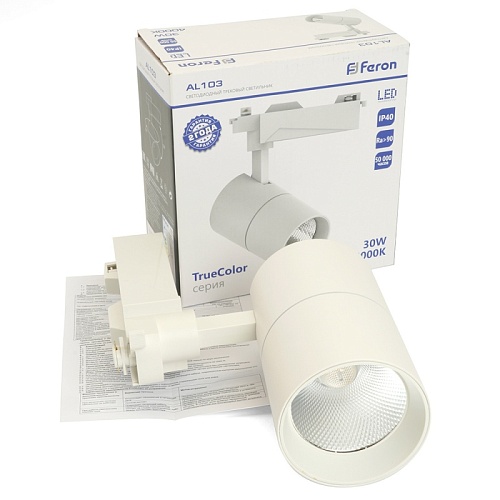 Характеристики Светодиодный светильник Feron AL103 трековый однофазный на шинопровод 30W 4000K, 35 градусов, белый с индексом цветопередачи >90Ra серия TrueColor